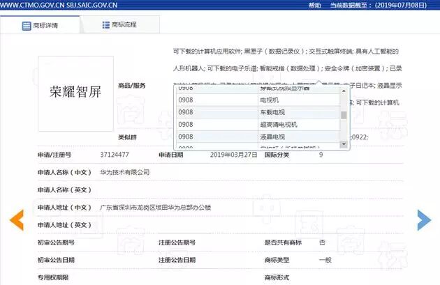这些商标包括“荣耀智慧大屏”、“荣耀智屏”、“荣耀智慧屏”、“荣耀Vision”等。不难看出荣耀即将带来的电视和传统意义上的电视机并不相同,毕竟带着“智慧”俩字。