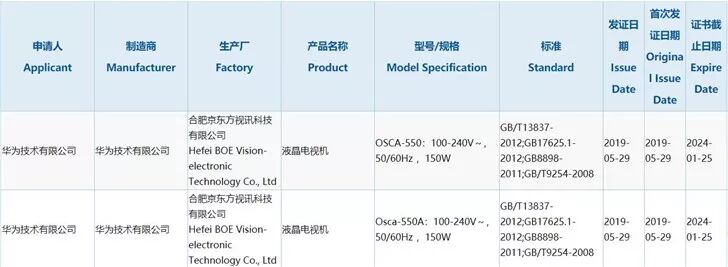 认证显示型号为Osca-550和Osca-550A两款华为电视,由合肥京东方视讯科技有限公司生产。