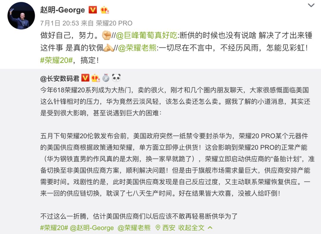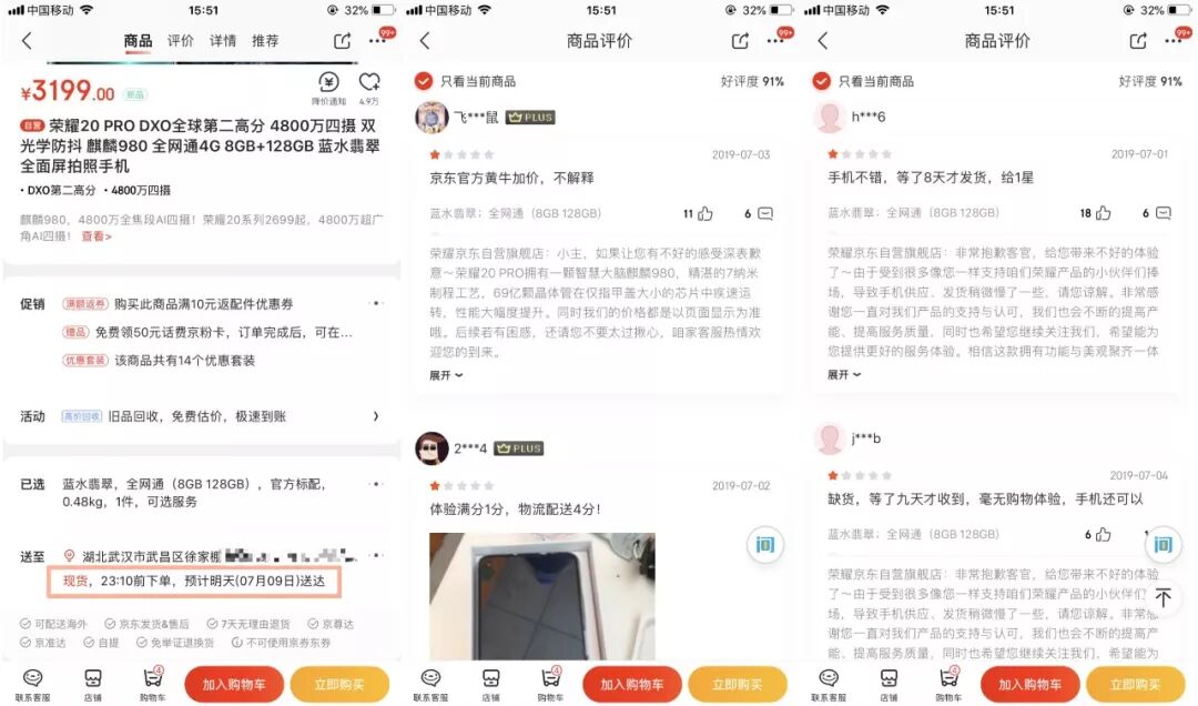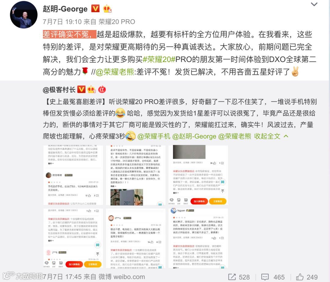荣耀20Pro发布于5月30日,曾于6月18日首销,但没想到遇到一些“断供”原因导致后续供货跟不上最终延迟发货,也因此有不少支持荣耀20Pro的用户在评价中给出了 一星 的差评,官方显然也是自知理亏,对这些评价表示“不怨”。