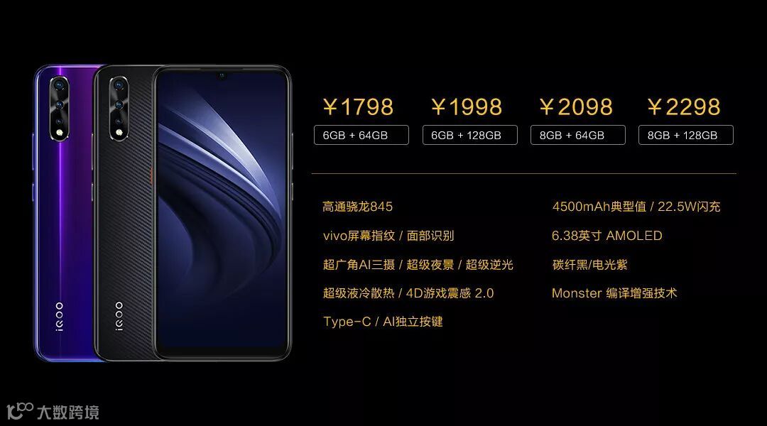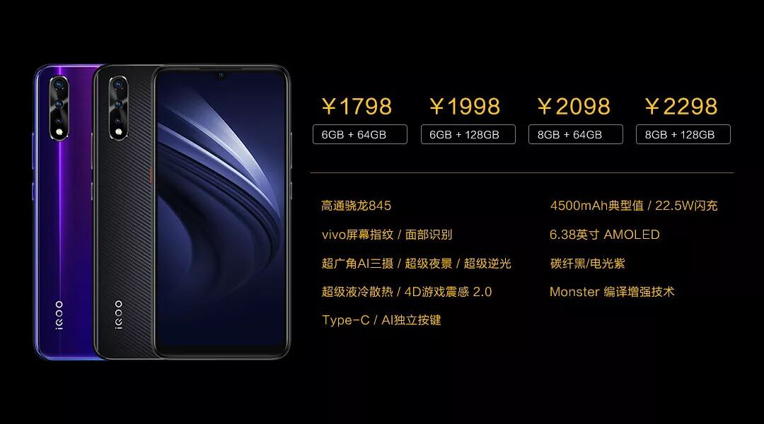 配置上,iQOO采用6.38英寸的AMOLED水滴屏,屏幕指纹,后置三摄1200W双核主摄+800W超广角镜头+200W景深镜头,骁龙845处理器,4500mAh电池,22.5W快充,保留3.5mm耳机孔,无NFC,售价6+64GB 1798元起步,同规格相比友商主打自拍的骁龙710机型小米CC9便宜1块钱。