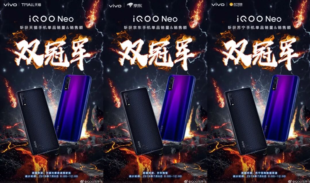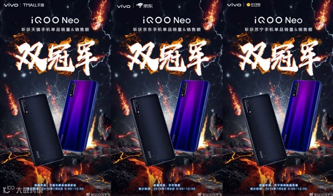 另外,今天上午10:00,少有的新年搭载去年旗舰U的新机——iQOO Neo正式开售,就官方的总结海报来看,iQOO Neo在0:00-12:00时间段内拿下了天猫、京东、苏宁三大平台的 单品销量&销售额双冠军。