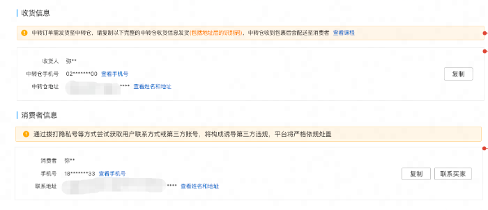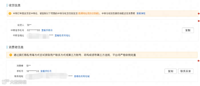 (1)【收货信息】为中转仓信息,商家需要将货品发送至中转仓,中转仓收到包裹之后会配送至消费者。