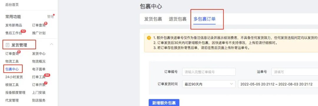 若一个订单需拆分为多个包裹寄出,需将中转仓售后地址完整打印包括识别编码,并在【商家后台-包裹中心-多包裹订单】上传所有的包裹信息。