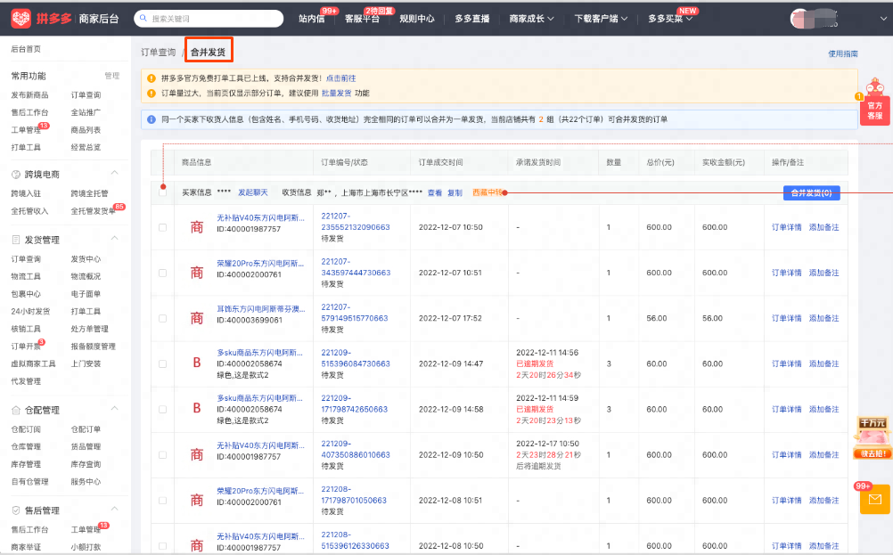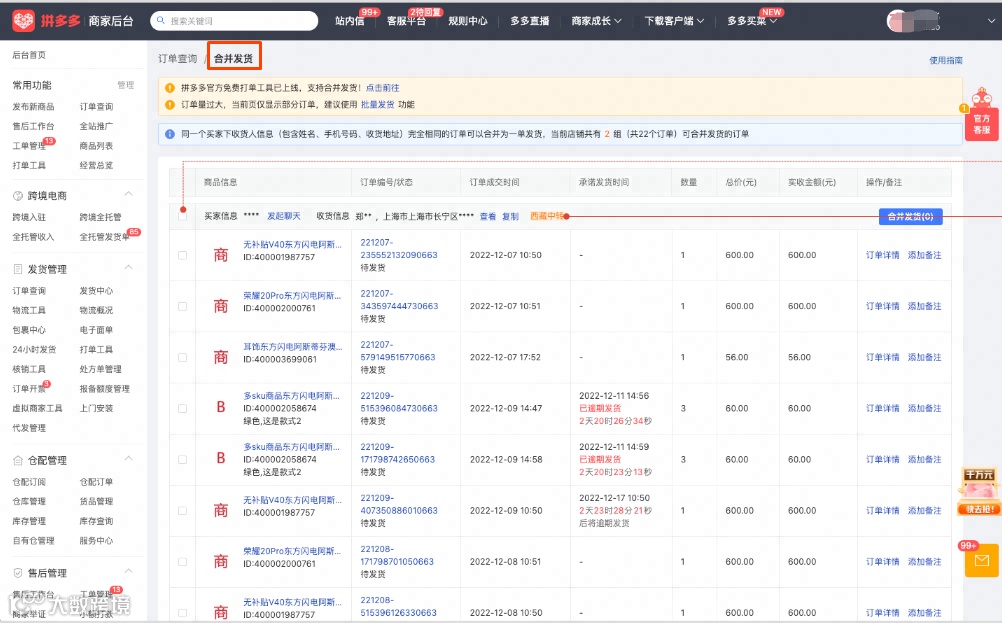 若存在同个消费者多笔订单需合并发货,在订单页,可点击进入合并发货页面,勾选对应西藏中转订单,【合并发货】即可