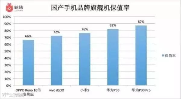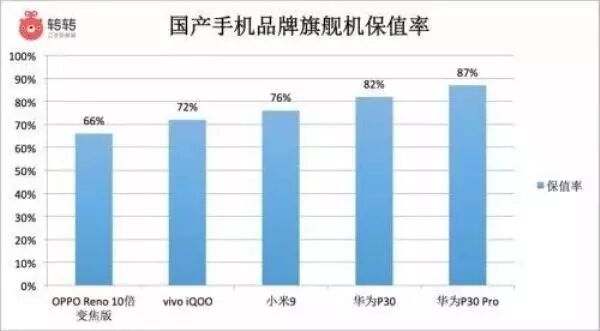 除了价格,保值率也是消费者在选购二手手机时的重要参考因素。根据转转数据,华为手机的保值率在所有国产品牌中排第一,具体型号上,国产旗舰机保值率TOP5分别是:华为P30 Pro(87%),华为P30(82%),小米9(76%),vivo iQOO(72%),OPPO Reno 10倍变焦版(66%)。