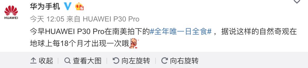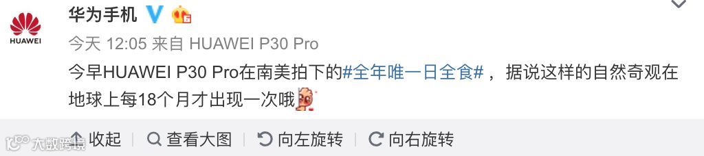 华为官方微博也放出了一张用华为P30 Pro拍出的日全食,和努比亚Z20的样张相比,P30Pro或得益于那颗800万像素的潜望式结构长焦镜头(f/3.4、5倍光学变焦、10倍混合变焦、50倍数码变焦),样张的“日全食”更大。