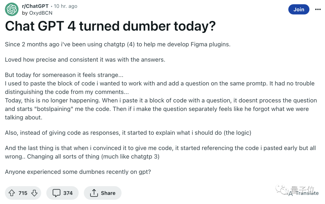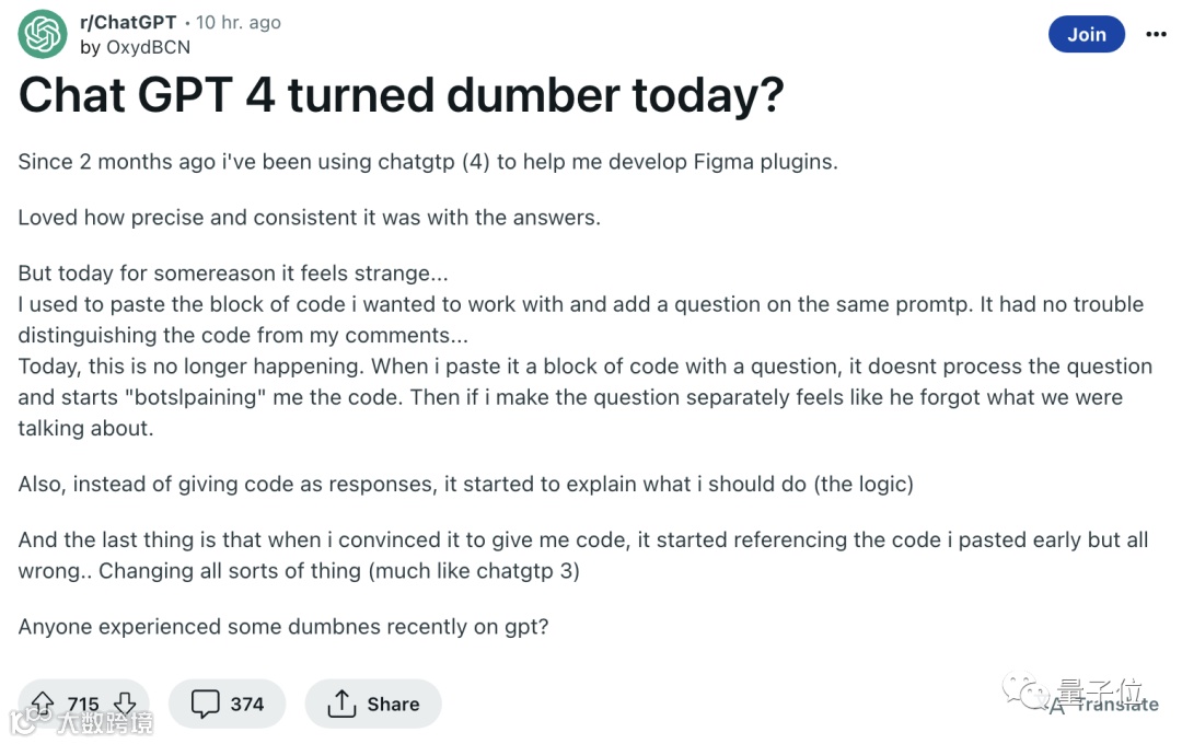 比如Reddit上一篇帖子提到,原来能回答代码问题的GPT-4,现在连哪些是代码哪些是问题都分不出来了。