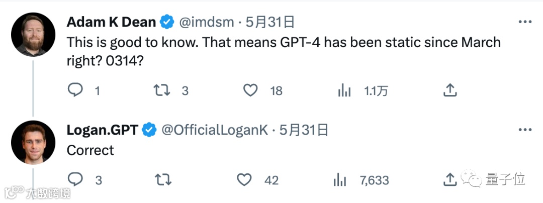 不放心的网友继续追问确认“就是说GPT-4自从3月14日发布以来都是静态的对吧?”,也得到了Logan的肯定回答。