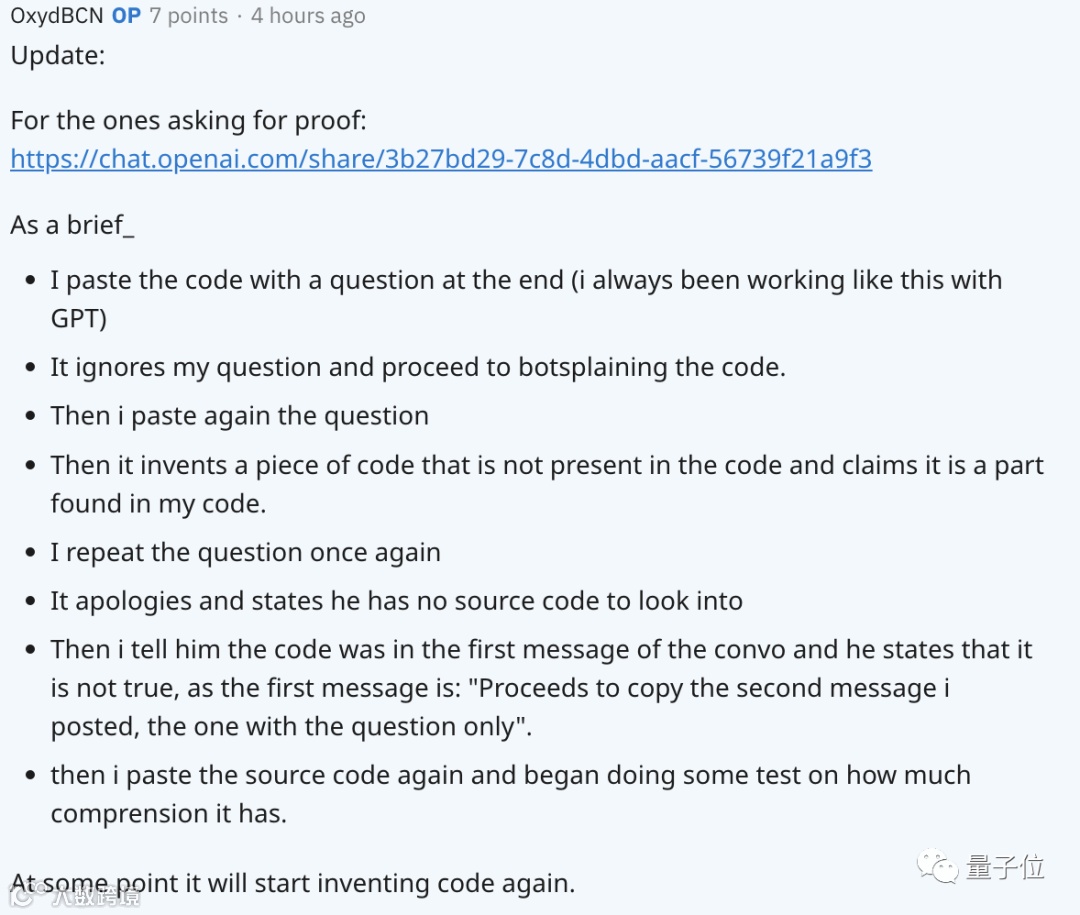 在其他网友的追问下,帖子作者对问题出现的过程进行了概述,还附上了和GPT的聊天记录。