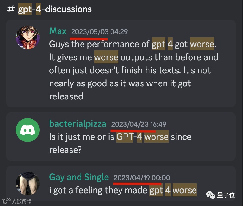 我们在OpenAI官方Discord频道中搜索,发现从4月下旬开始,就不时有零星用户反馈GPT-4变差了。