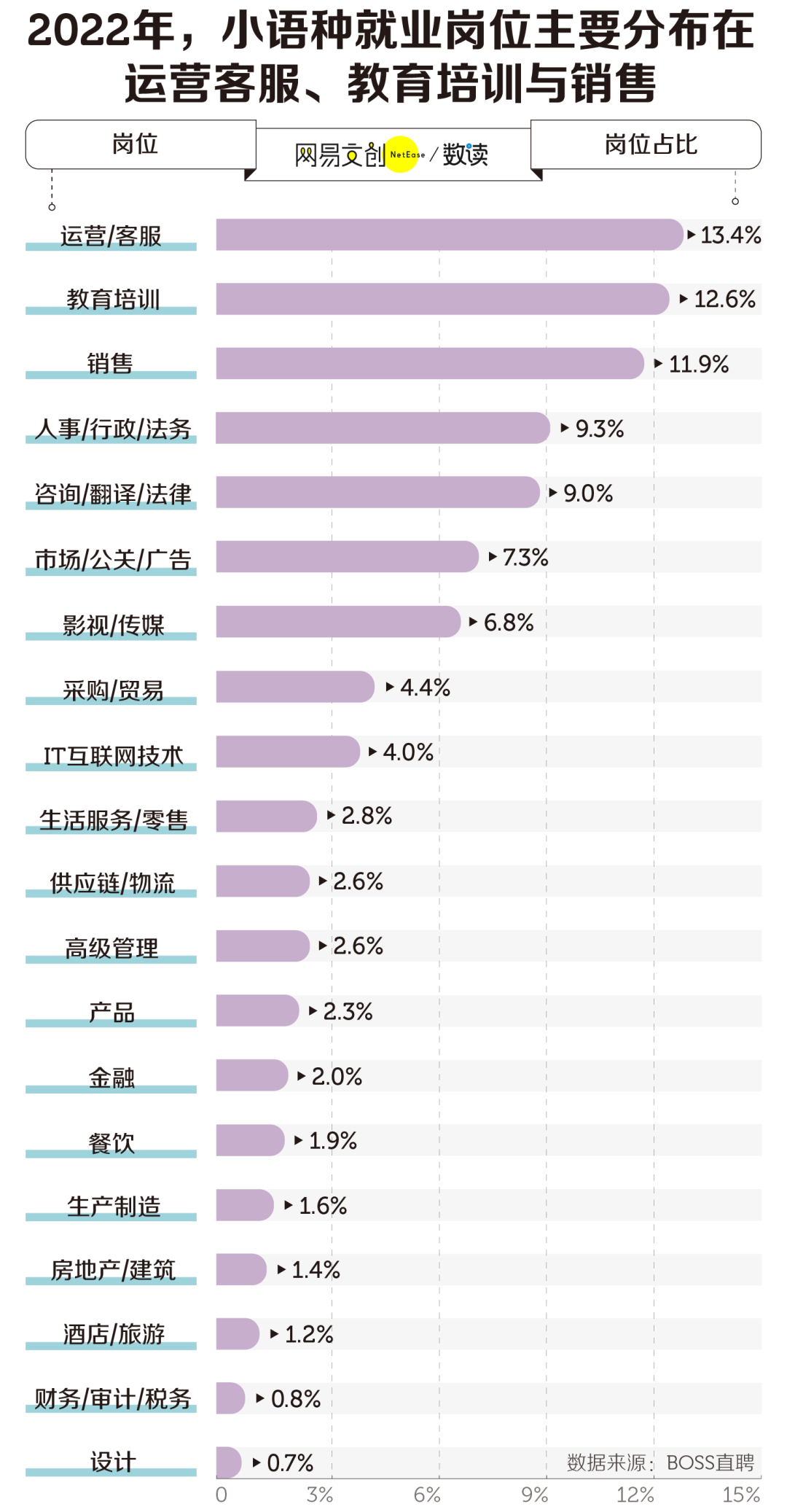 据 BOSS 直聘 2022 年调查显示,目前小语种就业岗位主要分布在运营客服、教育培训与销售这三大类门槛不高的行业。