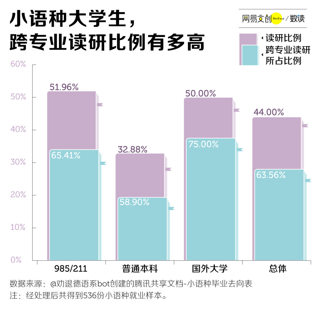 即便如此,一份超过 500 人次填写的小语种毕业去向表的数据显示,在读研的小语种学生中,半数以上选择了其他专业。