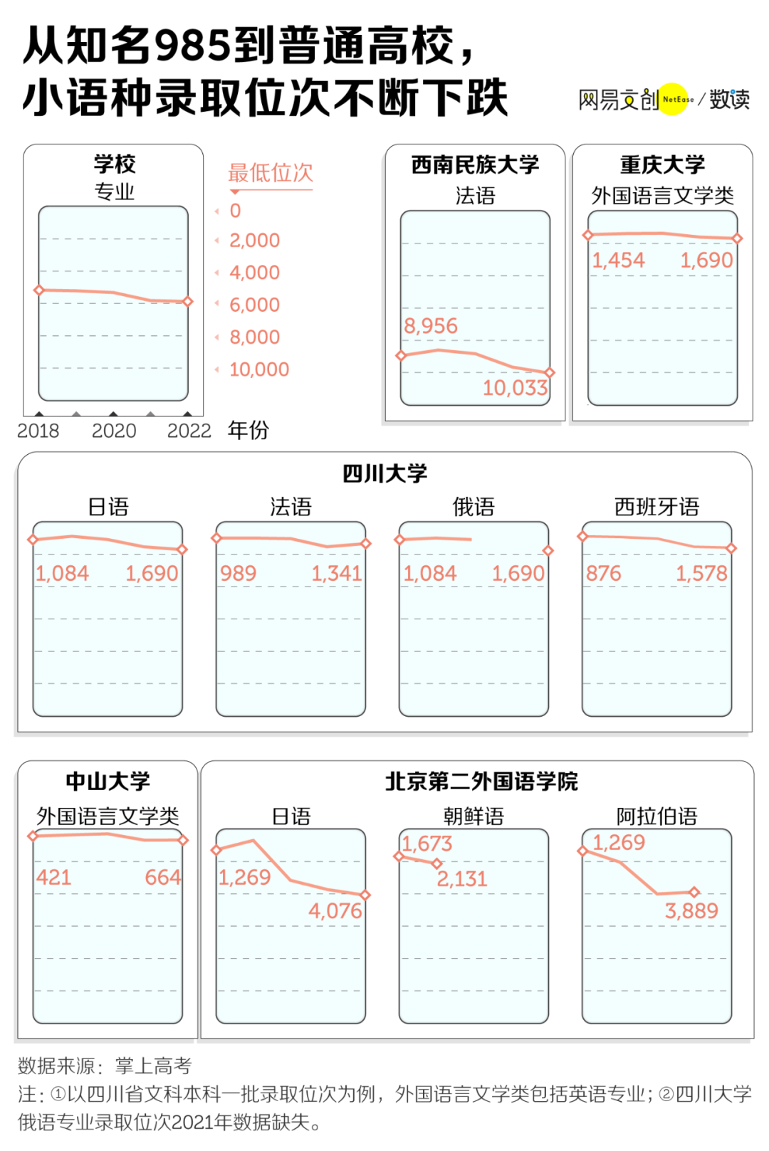 遇冷的不止专业性强的外语类院校,从知名 985 院校到普通大学,小语种专业的录取位次也在近几年持续走低,甚至成为一些高校录取分数线最低专业和调剂专业 [1]。