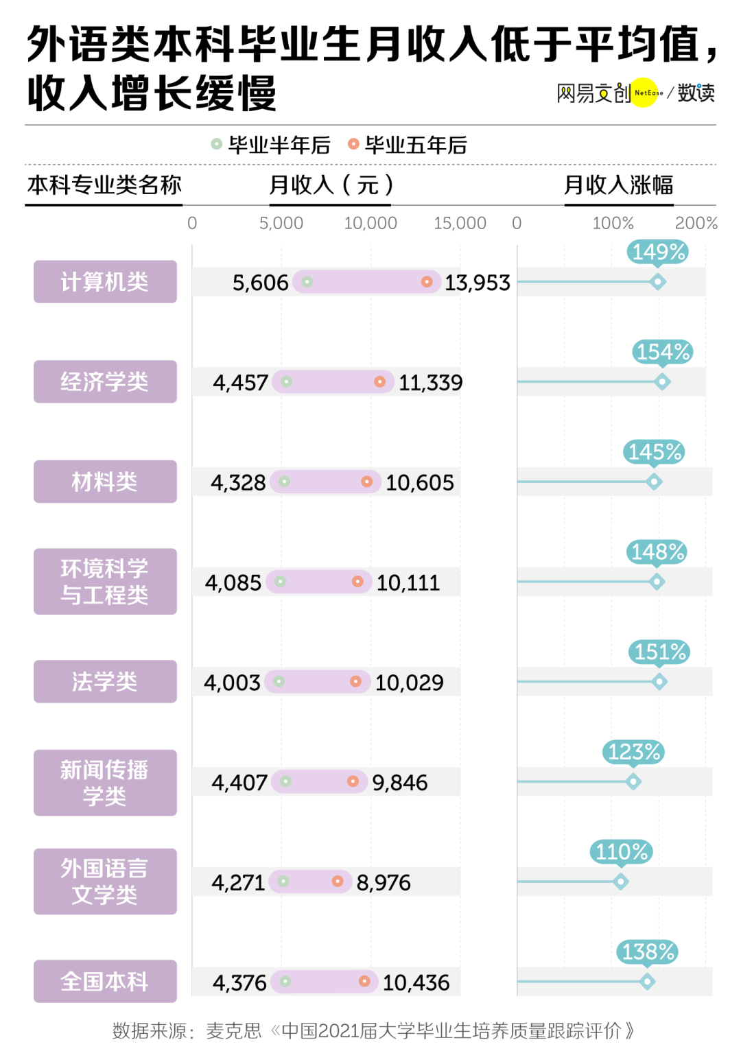 根据麦可思的数据,包括英语专业在内的 2016 级外国语言文学类本科毕业生,五年后平均月收入为 8976 元,低于全国本科平均水平,月收入涨幅也仅为 110%,同样低于所有专业类的平均涨幅。