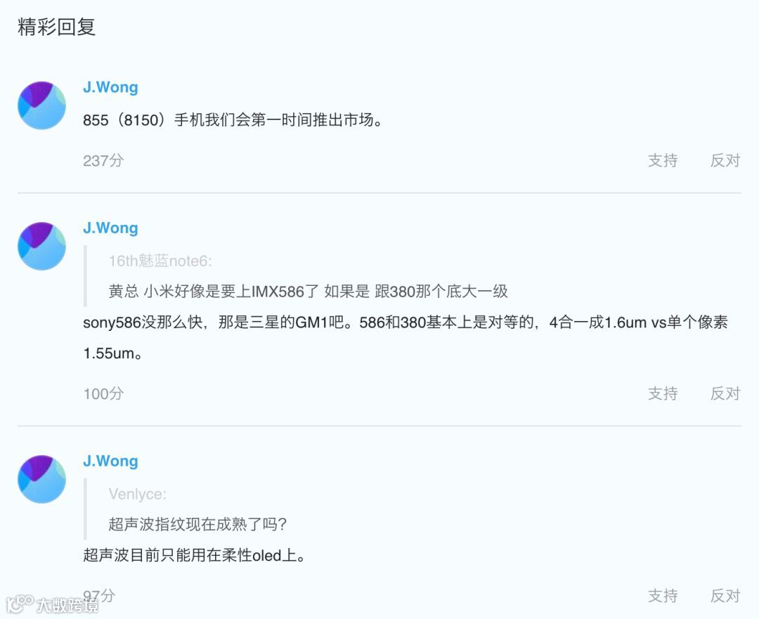 如图,黄章表示,超声波指纹目前只能用在柔性OLED 屏幕上;对于小米那款神秘新机,黄章也当了一波“内部人员”,称索尼IMX 586没那么快,小米新机更有可能是三星GM1,这也和小白的分析一样~