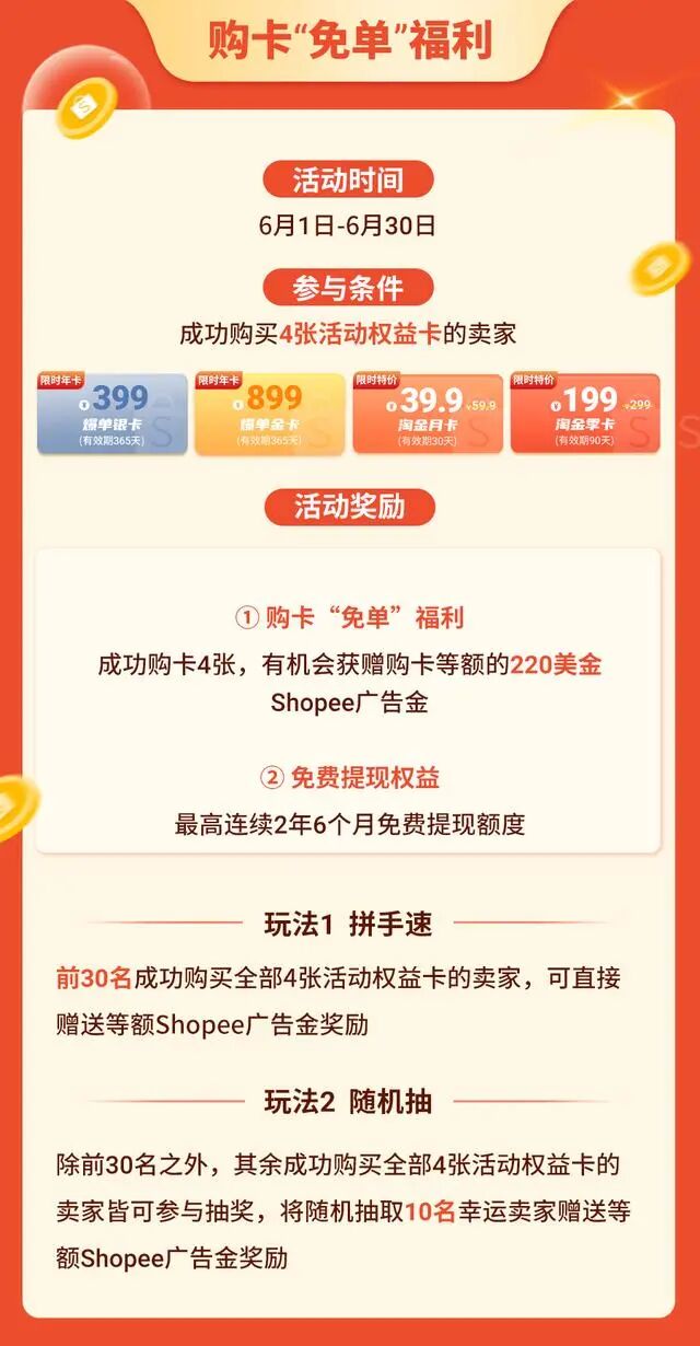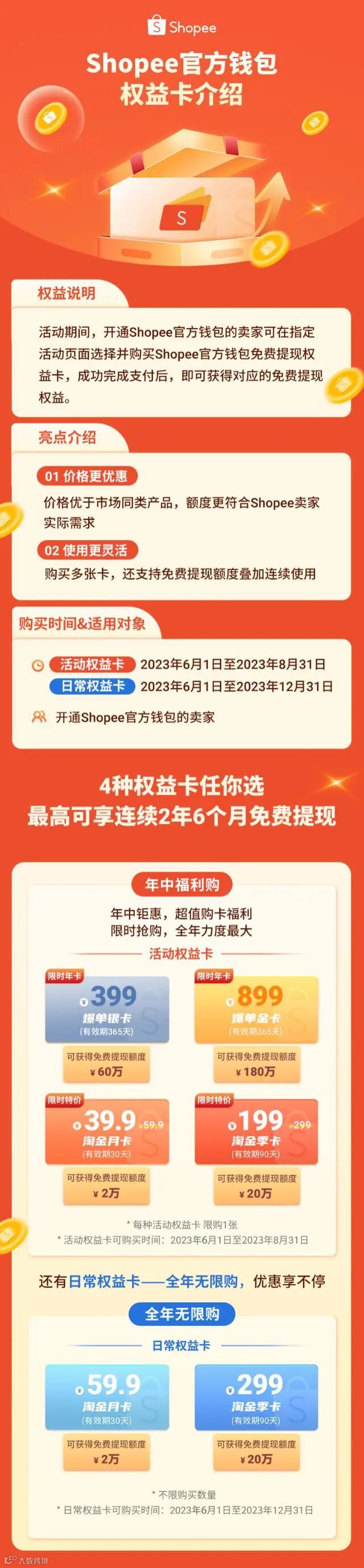 活动权益卡的购买时间为2023年6月1日至2023年8月31日,日常权益卡的购买时间为2023年6月1日至2023年12月31日。仅限已开通Shopee官方钱包的卖家购买。此外,在活动期间购买Shopee官方钱包权益卡的卖家还有机会参与限时福利活动,即“购卡免单”。活动时间为2023年6月1日至6月30日,成功购买4张活动权益卡的卖家有机会获赠等额的220美元Shopee广告金和最高连续2年6个月的免费提现额度。购卡入口位于Shopee中国卖家中心后台的财务- Shopee官方钱包- 我的权益卡页面。