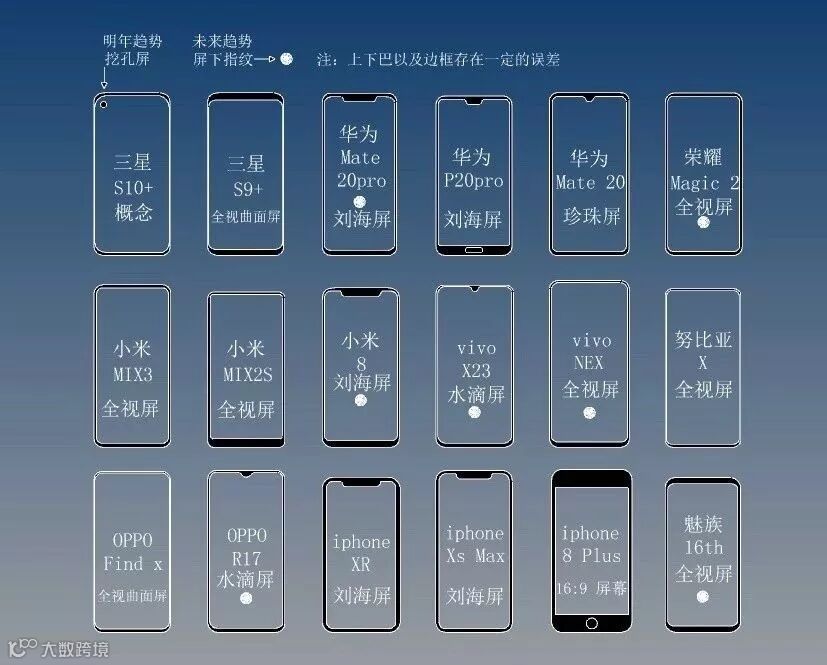 聊聊现在的手机发展趋势,有小伙伴投稿了一张自己总结的 2018全面屏机型形态一览,从16:9到迎来刘海屏、水滴屏、再到升降式全面屏、滑盖全面屏、双屏,以及即将到来的挖孔屏,真的是眼花缭乱。