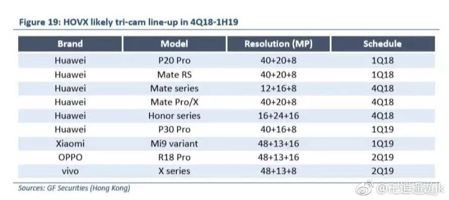 广发证券发布的智能手机产业链报告表示:索尼IMX 586传感器已经出货,小米、华为、vivo等手机厂商是首批客户。小米9也是其中之一:将于2019年2~3月发布,采用4800W+1300W+1600W的三摄组合。