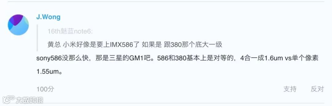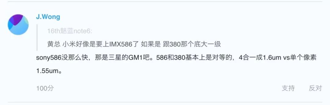 需要注意的是,小米9身上的4800万像素不是三星GM1那颗,是索尼IMX 586,其传感器面积为1/2.3英寸,单位像素0.8微米,黄章前两天直言:586和IMX380“差不多”:前者4合一成1.6μm,后者单个像素1.55μm。