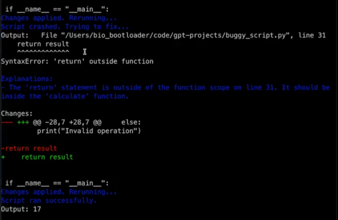 紧接着,Wolverine 再次咨询了 GPT-4,创建并格式化了一个修改,应用它,并重新运行修改后的脚本。这一次,脚本成功运行,Wolverine 的工作完成了。