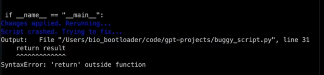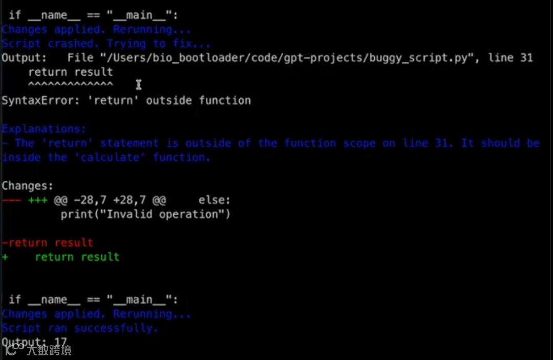 BioBootloader 在 Twitter 上分享了一条 demo 视频,并写道,“用它运行你的脚本,当它们有问题时,GPT-4 会自动编辑程序并解释出了什么问题。即使程序有很多错误,它也会反复重新运行,直到一切都修复了。”