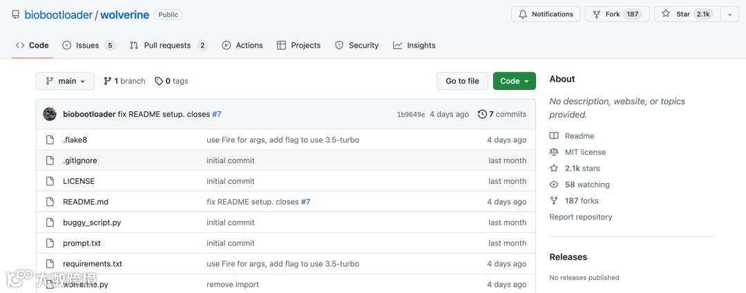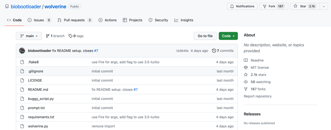 当前,wolverine 代码已在 GitHub 上开源:https://github.com/biobootloader/wolverine,且短短时间便收获了 2.1k 个 Star。