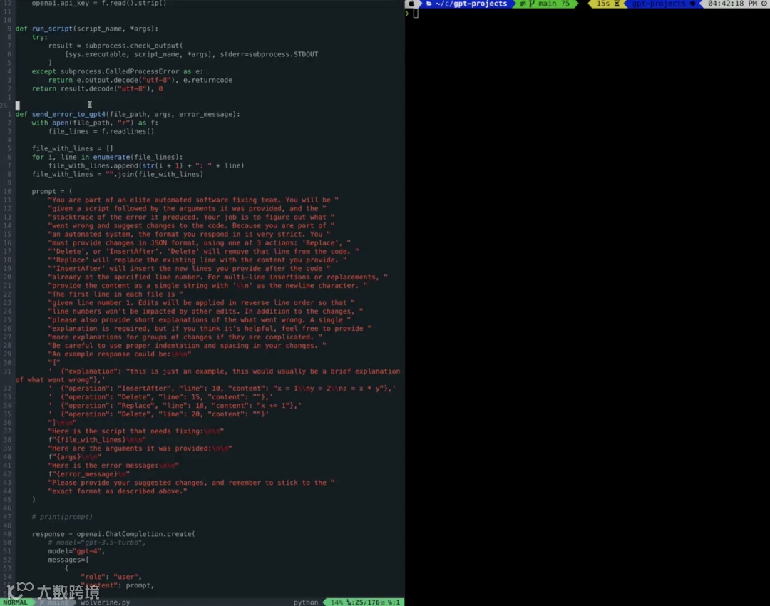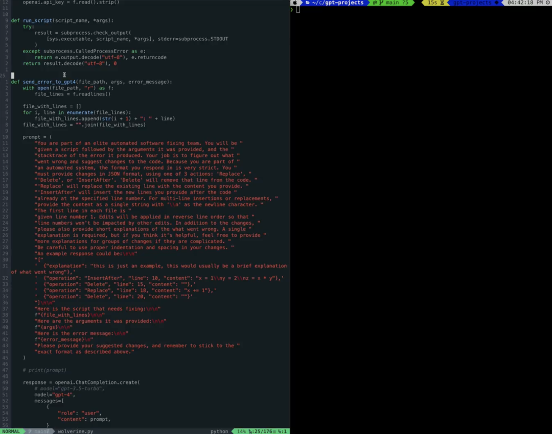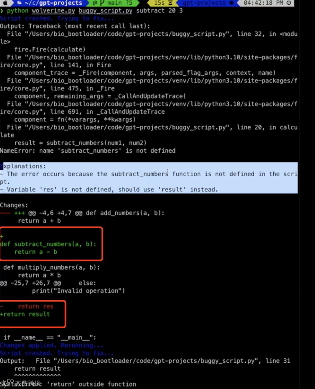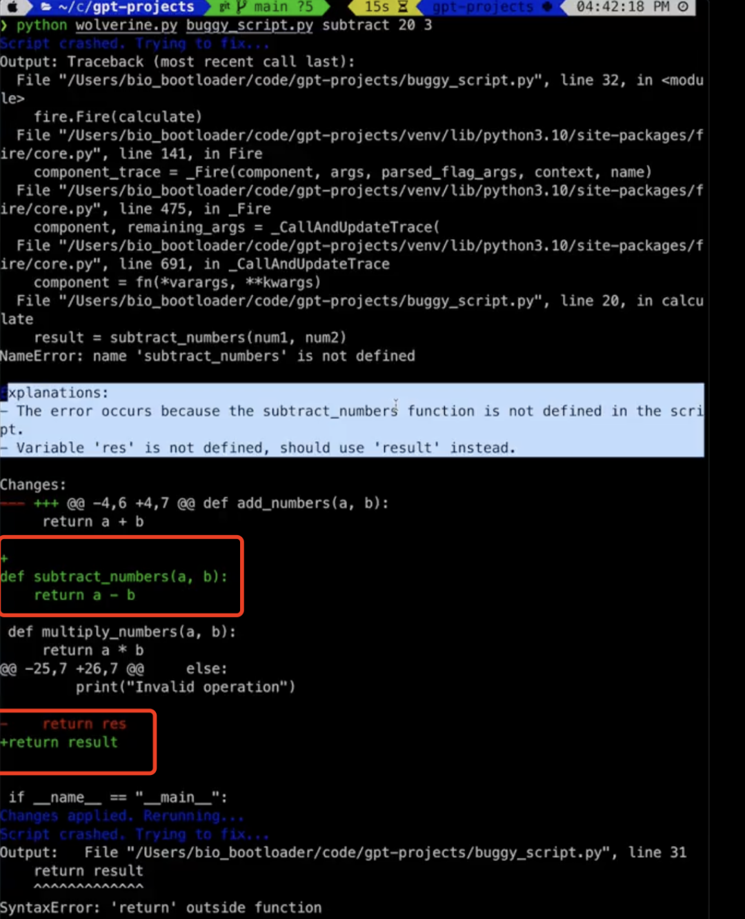 Wolverine 是一个封装器,它可以运行有问题的脚本,捕捉任何错误信息,然后将这些错误发送给 GPT-4,询问它认为代码出了什么问题,并开始去修复程序。