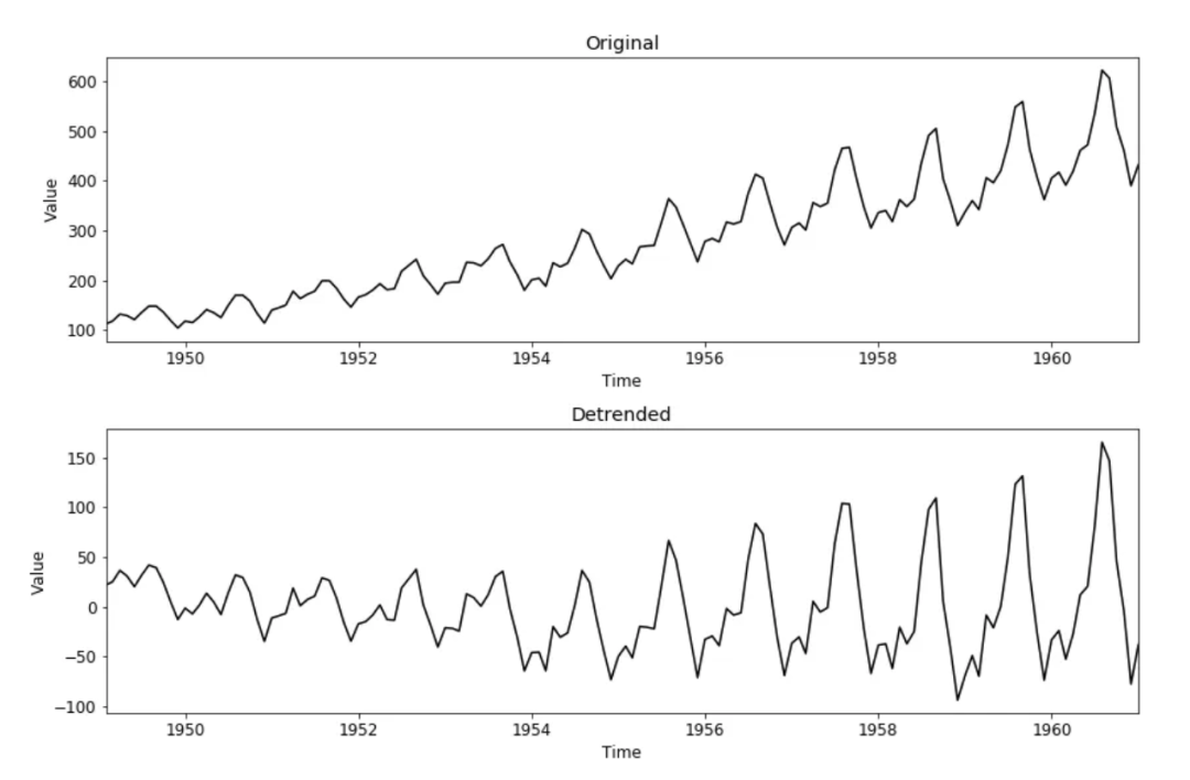 从非平稳时间序列中去除趋势的一种方法是将一个简单的模型(例如,线性回归)拟合到数据上,然后对该拟合的残差进行建模。