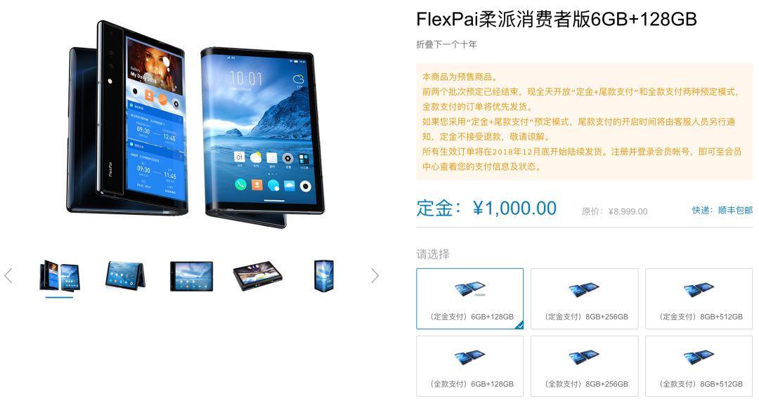 如图,柔宇科技推出的FlexPai柔派智能手机在其官网开启预售,目前已经进行到第三批预售阶段,6+128GB售价8999元,搭载骁龙855,将于2018年12月底开始陆续发货,这是拿下首发的节奏?