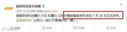 就在今天下午,联发科官方微博对魅族的发布会进行了预热。联发科表示,“搭载联发科技曦力P25和曦力X30的魅族智能手机将在7月26日正式发布”。