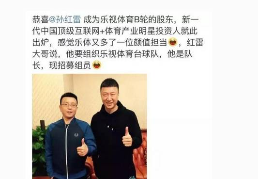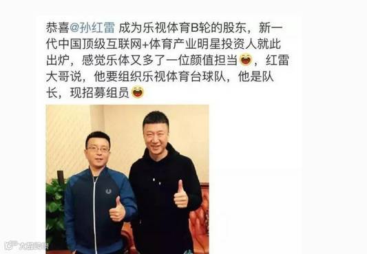 2016年3月,乐视体育完成B轮融资80亿元。此次融资中,刘涛、孙红雷、贾乃亮、周迅、王宝强等11位明星投资人对乐视体育投资金额总计近2亿元,刘涛一人投资高达5000万元。
