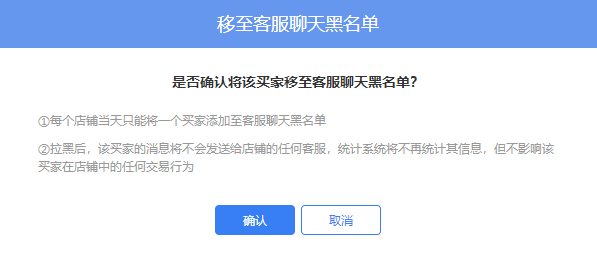 ②遇到无理取闹的买家,可以在客服聊天页面拉黑或者举报该买家。举报成功后,该买家发送的消息不计入您的回复率;拉黑后,该买家的消息将不会发送给店铺的任何客服,统计系统将不再统计其信息,但不影响该买家在店铺中的任何交易行为。(注意:举报拉黑买家的时候无需给买家发送“我要向平台拉黑、举报你”等威胁语句。以免激化矛盾)