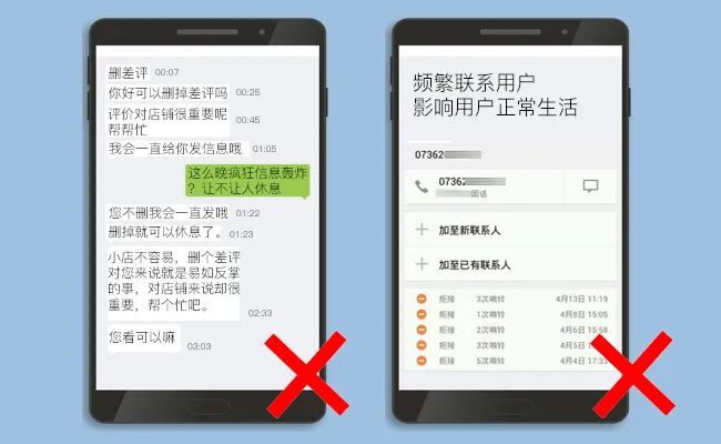 (2)通过电信、短信、电子邮件、平台客服功能/工具等方式向用户发送垃圾信息或频繁联系,造成用户反感。