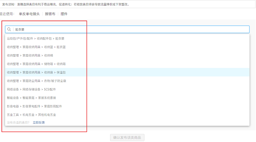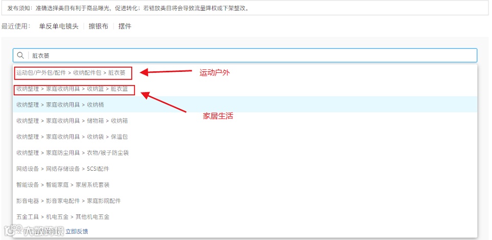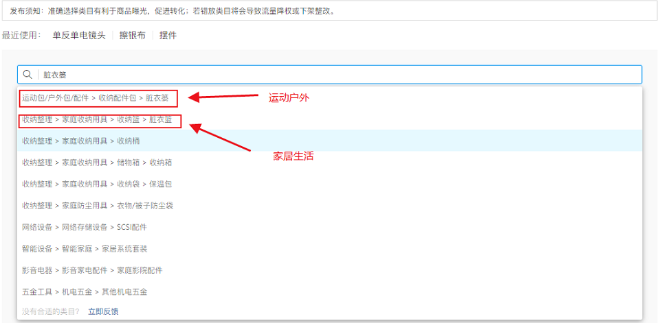 上图中,输入“脏衣篓”,推荐的第一个分类,显然不属于家居生活这个主营类目下的分类,虽然我们这么选择分类也可以上架商品,但是这个分类不属于商品的最佳分类。