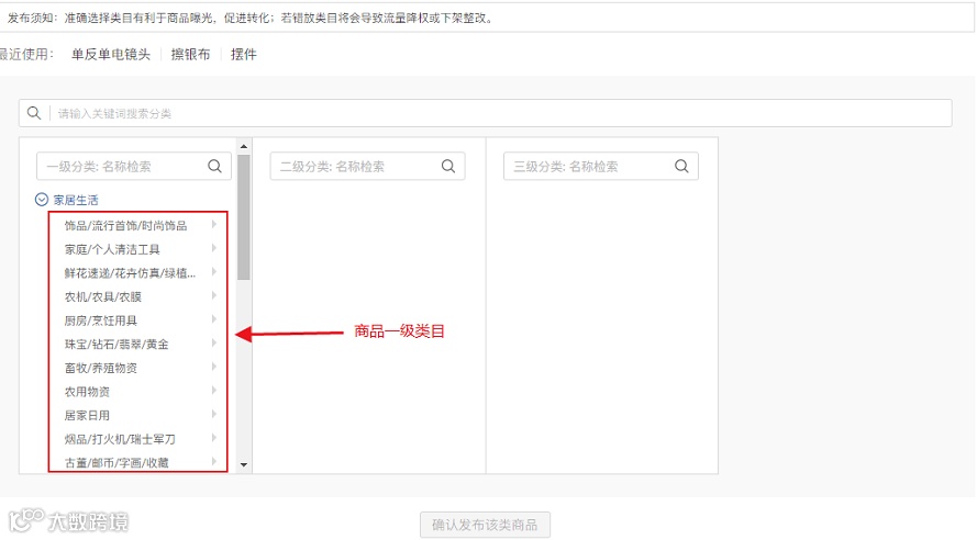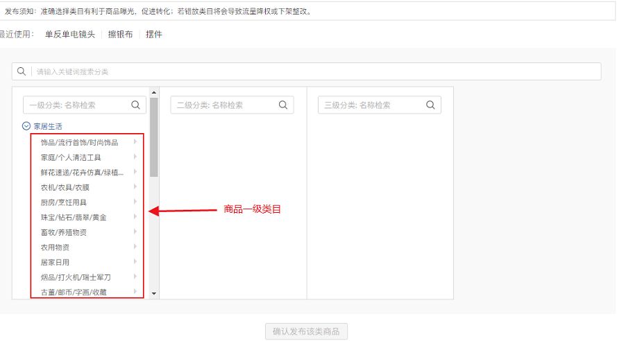 (2)根据店铺的主营类目选择商品的一级类目,此处以家居生活为例,展开家居生活可见该类目下的所有的商品一级类目。