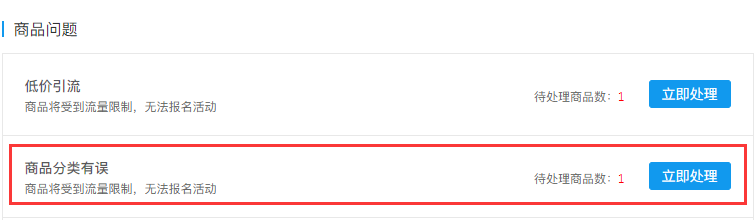 第二步:点击立即体检,系统就会将店铺的商品问题展示出来,如果店铺商品存在分类有误的问题,那么体检结果中将展示“商品分类有误”这一项,点击右侧的“立即处理”按钮,就能看到店铺内有哪些商品的分类选择有误。