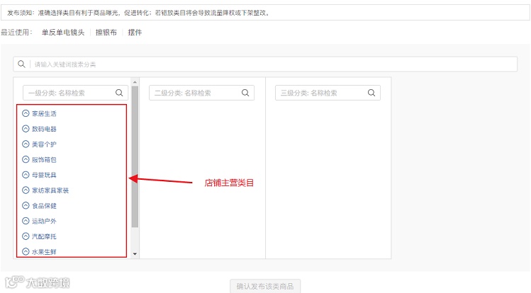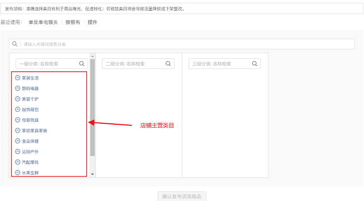 ②选择推荐的分类后,要定位清楚所选商品一级分类是否在店铺主营类目范围下。