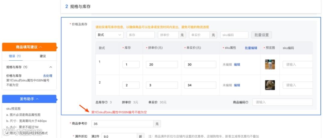 如果漏填货填写不规范的将在“价格及库存”模块的左下角提示错误