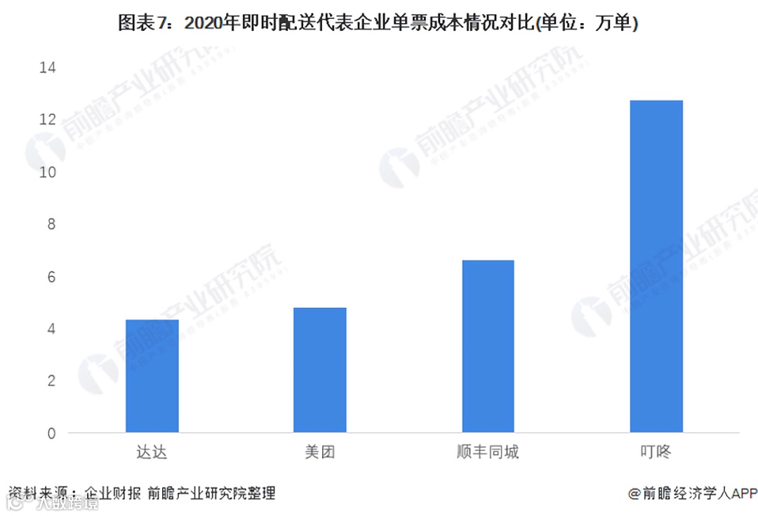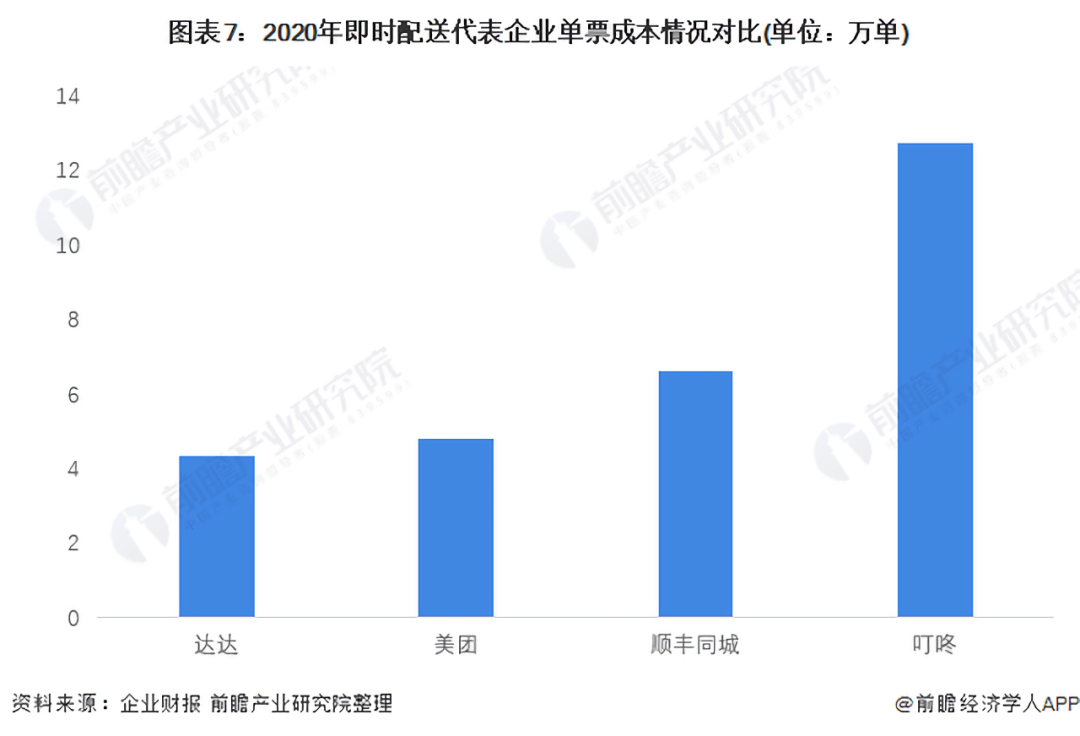 不过,虽同城配送在运输上占据优势,但其所带来的成本问题,对于中小商家而言,却是一把悬在头上的利剑。根据前瞻研究院所提供的数据显示,2020年即配企业中,单票成本最低的是达达快送,为4.3元/单,其次是美团外卖的4.8元/单、顺丰同城的6.6元/单、叮咚买菜的12.7元/单。