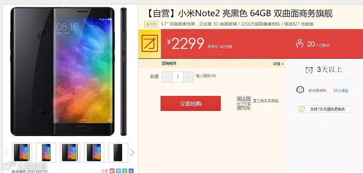 本月10日小米推出了6+64版本的Note 2,售价为2899元,下单立减300元,也就是说只需2599元即可购得这款双曲面旗舰。