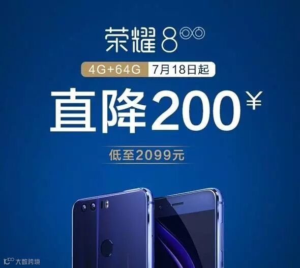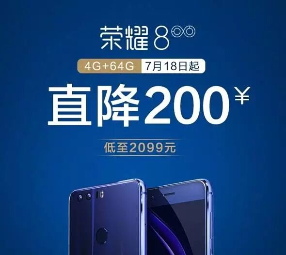 发布至今恰好一年,今天,荣耀8顶配版(4G+64G)宣布直降200元,低至2099元。