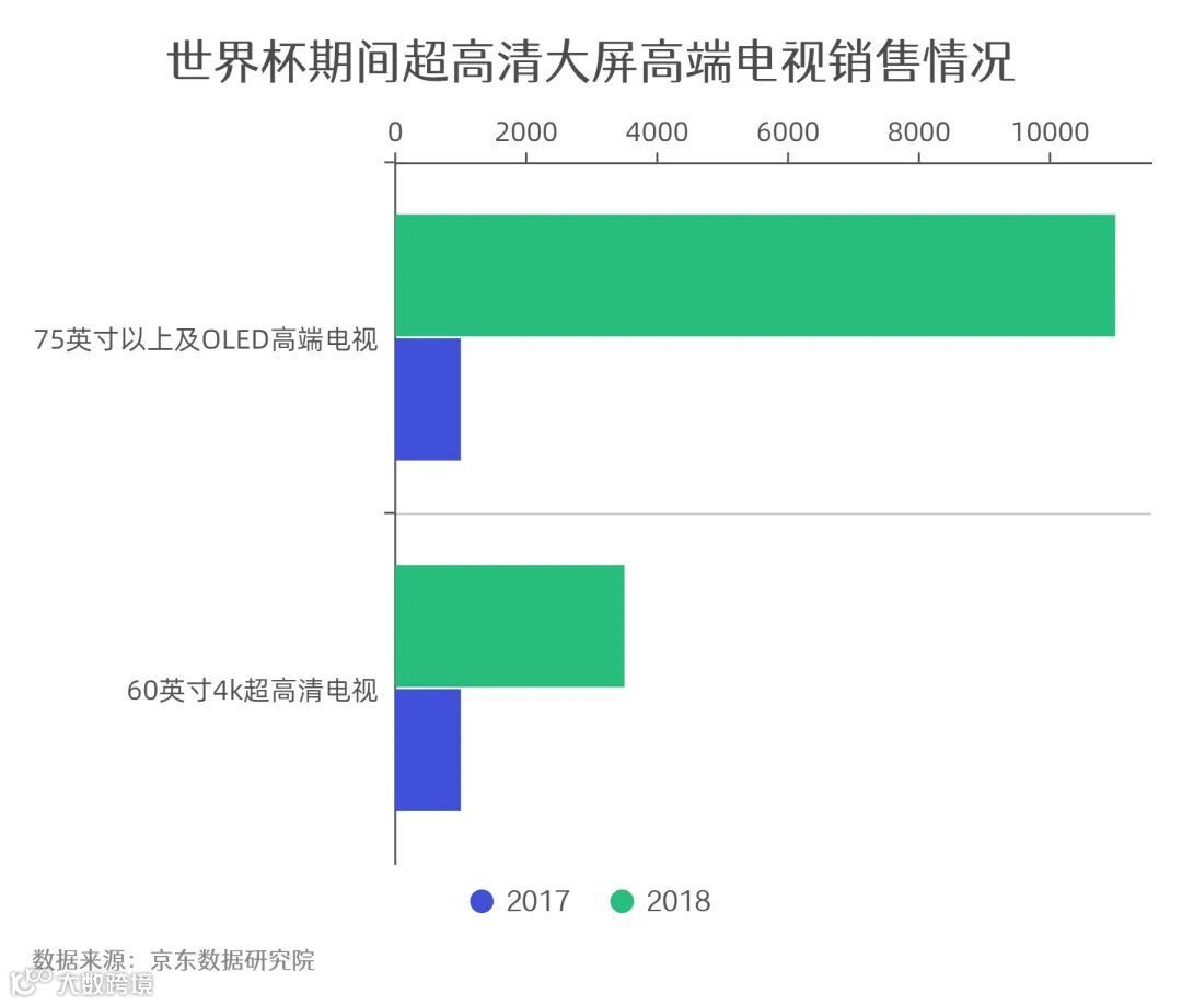 而无法去现场的球迷,也对观赛设备有了更高的要求,在世界杯期间,超高清大屏高端电视的销售额均大幅增长。