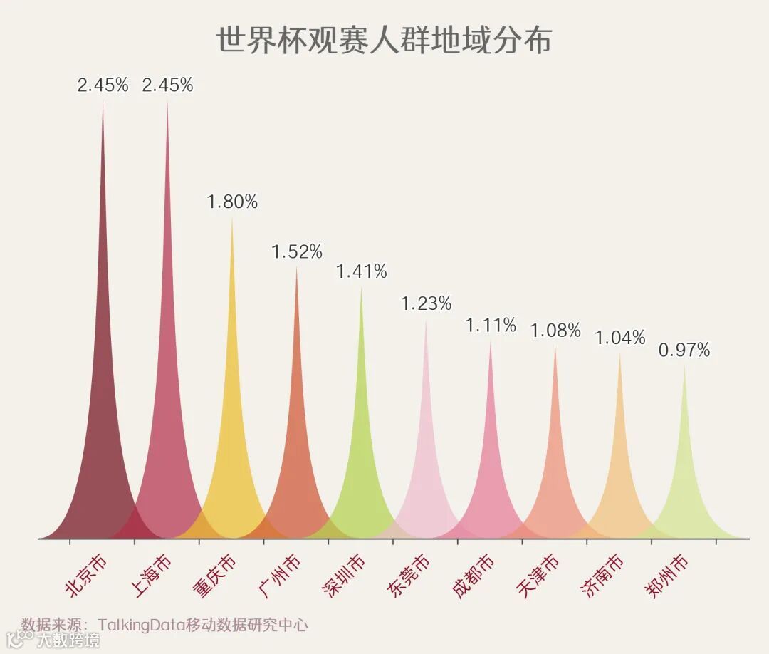 而世界杯观赛人群的分布,也与区域人口特征呈一定的相关性。根据统计数据显示,主要观赛人群集中在东部人口大省,在城市分布上,北京、上海、重庆三个人口超2000万的城市包揽了世界杯观赛人群城市分布的前三位。