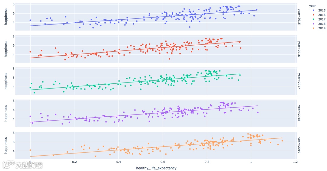健康预期寿命与幸福得分呈高度线性正相关关系,健康预期寿命越高的国家,幸福水平相对越高。
