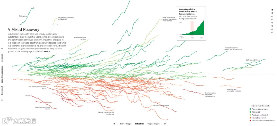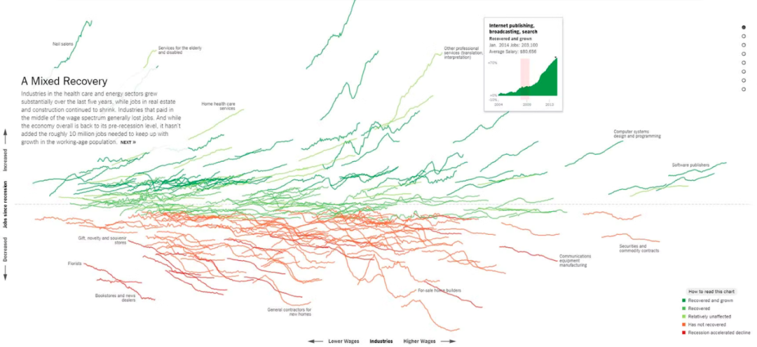 大衰退继续影响着美国经济。《纽约时报》使用数据可视化,包括几个信息丰富的折线图,来展示经济危机是如何重塑产业以及大衰退十多年后的工作机会的。