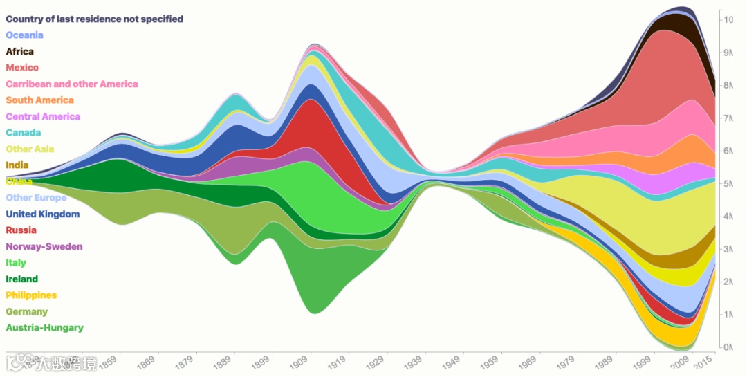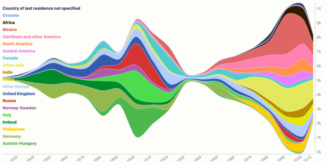 这个关于200年来向美国移民的可视化图显示了这些年来自世界不同地区的移民比例是如何变化的。