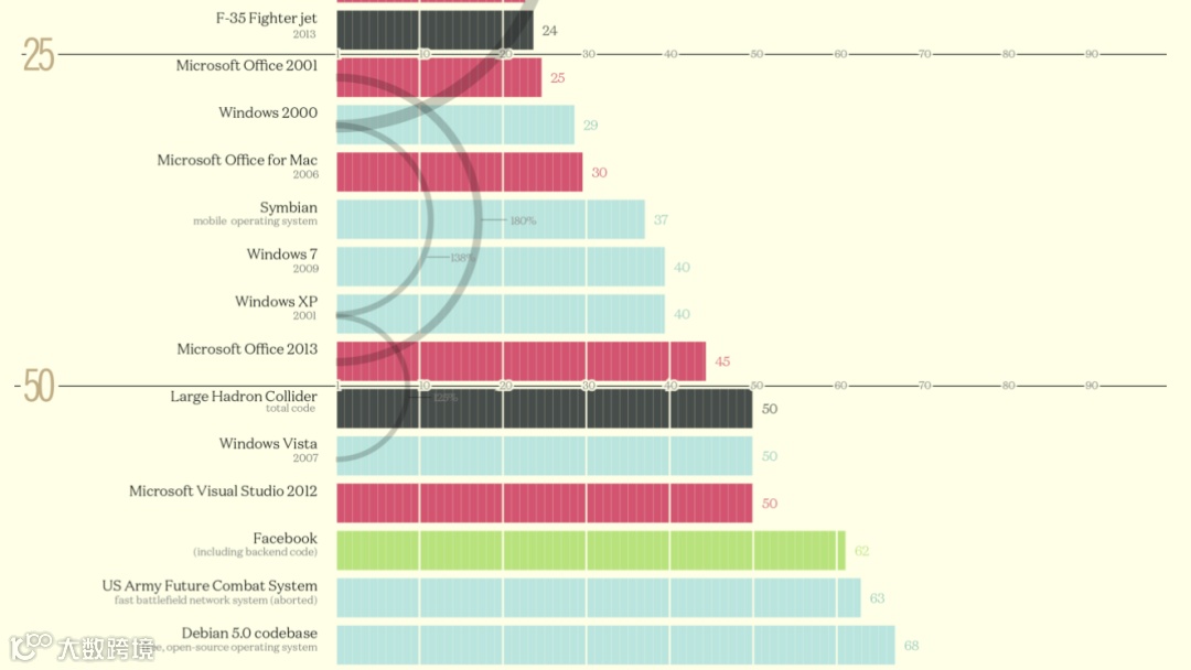 不同的代码库中包含了多少百万行的代码?这个条形图将该信息一目了然地传达出来。当你在处理数以百万计的数据时,这种类型的数据可视化可以帮助你把数据分解为更易于理解的图形。