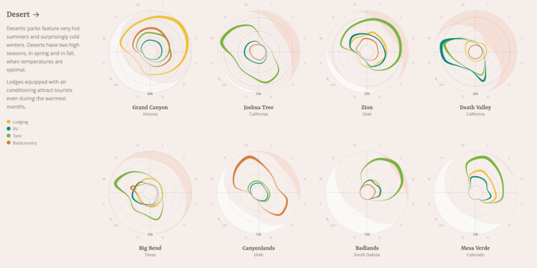 该雷达图有助于让大家更好地了解国家公园游客在一年中的特定时间是如何度过夜晚的。