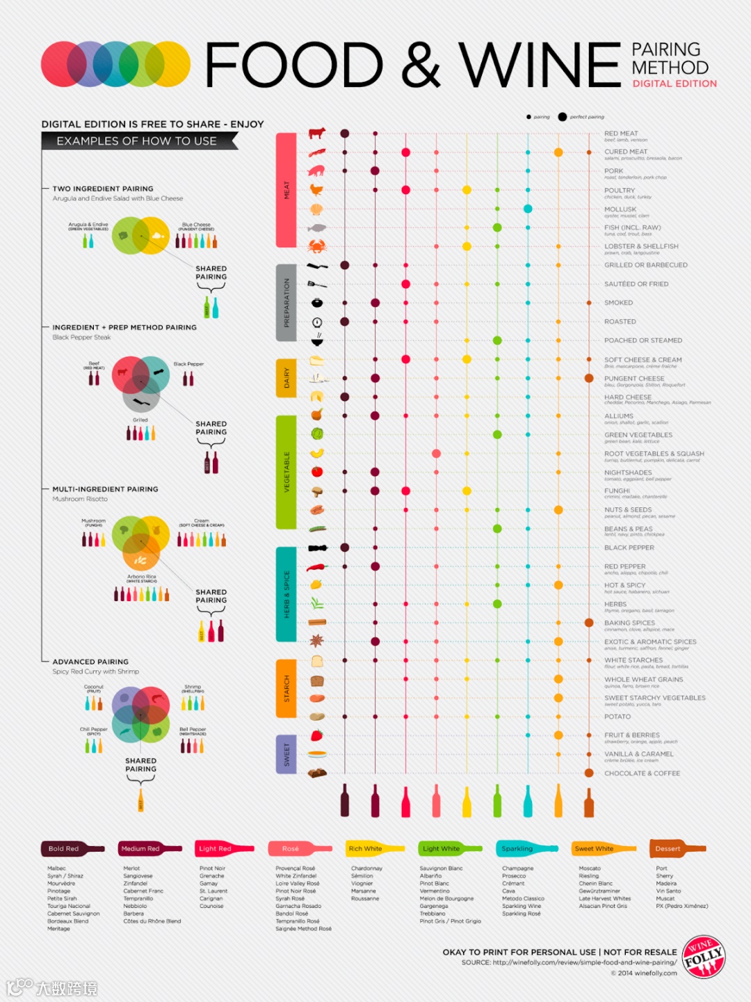 你可能知道某些食物比其他食物更适合搭配某些葡萄酒,但很少有人会记得特别清楚。这个表格可视化就总结出了各种食物跟不同葡萄酒的搭配,以便你在想菜单和就餐时参考。