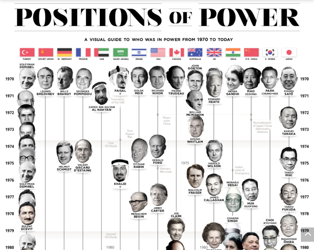 世界各国政府首脑对全球事件和历史有着深远的影响。这个时间线可视化提供了世界上重要国家领导人在位顺序和时间的详细信息。